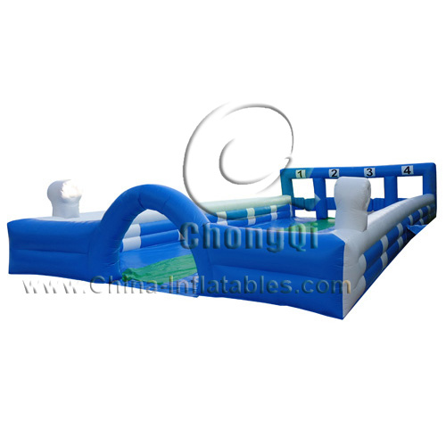 The football game hold in the inflatable football games pitch is the football game everyone can join in, young and old alike. Just like Table Football, and you know how addictive that can be! Try this version as a player yourself; simply put on a velcro belt and you’re ready to play. Player can only move left or right along the line they are attached to, as well as a short distance forward or backward. Even if people don’t enjoy watching or playing football, they will enjoy this game! No need to be super fit as you don’t have to run anywhere! The inflatable football pitch is ideal for Field Days, Fetes, Schools, Local Festivals, Youth Games Development, Corporate and Charity Events. The pitch dimensions can be customized according to your requirements for different uses and different room areas.