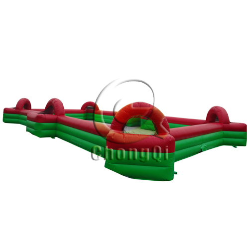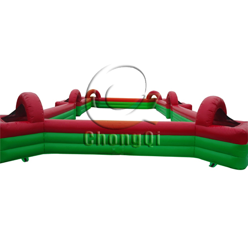 The football game hold in the inflatable football games pitch is the football game everyone can join in, young and old alike. Just like Table Football, and you know how addictive that can be! Try this version as a player yourself; simply put on a velcro belt and you’re ready to play. Player can only move left or right along the line they are attached to, as well as a short distance forward or backward. Even if people don’t enjoy watching or playing football, they will enjoy this game! No need to be super fit as you don’t have to run anywhere! The inflatable football pitch is ideal for Field Days, Fetes, Schools, Local Festivals, Youth Games Development, Corporate and Charity Events. The pitch dimensions can be customized according to your requirements for different uses and different room areas.
